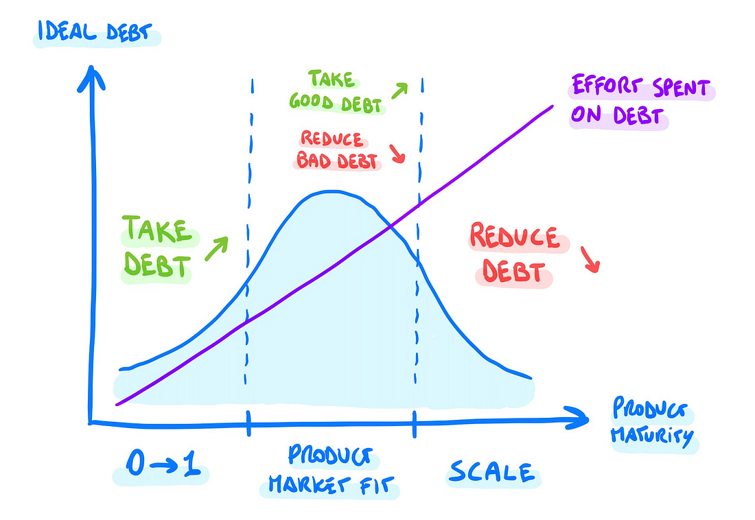 Most people answer 10 cents, which is System 1 stuff. The correct answer (5 cents) would require engaging System 2, but we usually accept the quick answer because it looks good. This reminded me of chess. During lunch I often watch Hikaru videos, where he often talks about the problem of knowing when to spend your time. Modern chess has shifted more and more towards shorter time controls (e.g. 10-minute games), which means players spend little time, on average, on every move. What’s interesting, especially in grandmaster games, is that players do not spend a similar amount of time on every move — they blitz most of them (i.e. few seconds) and spend long chunks of several minutes on a few crucial ones. Blitz moves are System 1—quick judgment and pattern-matching—while the long ones are when players engage their analytical brains. Knowing when it is worth spending more time on a move—i.e. when to engage System 2 vs when to trust intuition—is a crucial quality that separates outstanding players from the good ones. Similarly, in real life, we need to blitz most decisions because System 2 is 1) slow, and 2) extremely costly, while System 1 is basically free. But we can still create good strategies to fight our biases and give System 1 less leeway. You can find our full summary + review of the book below 👇 4) 🎒 Does intentional tech debt really exist?When it comes to startups and fast growing products, you may hear about taking on debt intentionally, as the result of prioritizing speed and growth over engineering quality. Regardless of whether this would make for a good strategy, in my experience, debt is most often inevitable rather than intentional. Fast growth, in fact, naturally leads to technical debt, because when the product changes at a fast rate, your engineering abstractions get invalidated equally fast. Such volatility, though, changes with the maturity of your product. For the sake of simplicity, let’s consider three stages:
