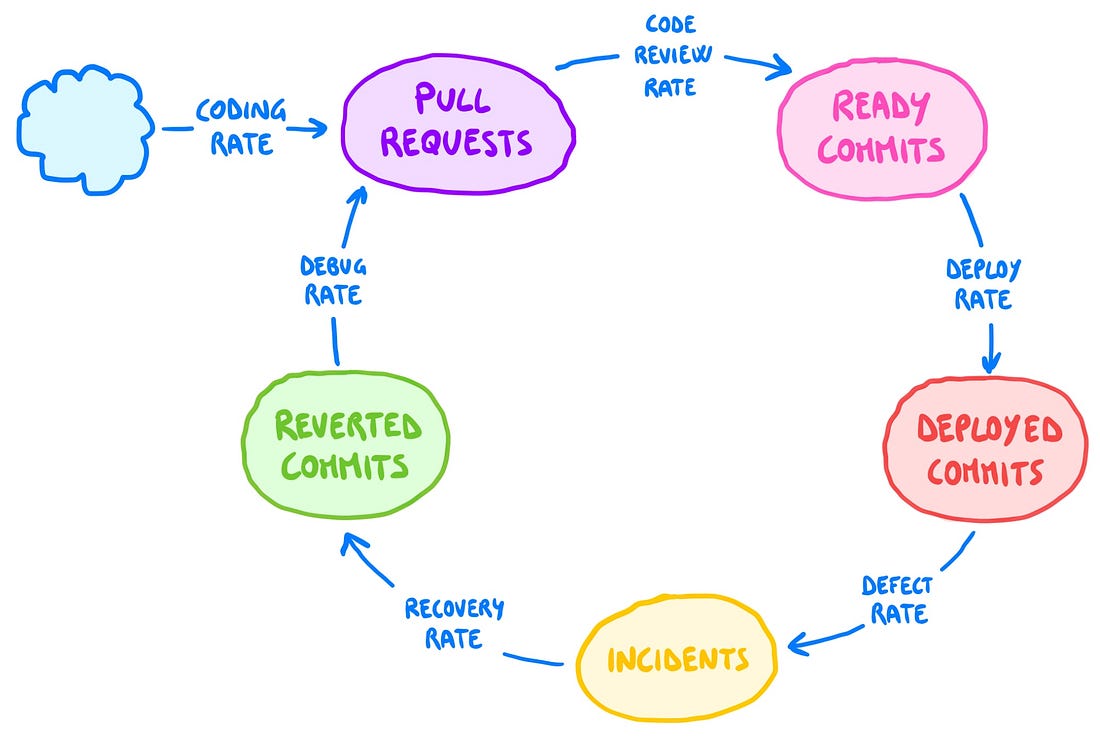 This looks extremely simple and, in fact, through the use of diagrams, it turns systems into equally simple boxes and arrows. Simple, though, doesn’t mean vague — on the contrary, stocks and flows are precise ideas that, applied well, can model infinitely sophisticated situations. One of the examples provided is about DORA metrics. The four metrics are flows that impact their respective stocks, and together model the software delivery process as a clear, predictable system (see picture). Now, thinking at your dev process as a system is still intuitive, or at least it should be, to managers and engineers who have been in the industry for more than a few years. The main virtue of An Elegant Puzzle, though, is that it applies this line of thinking to everything. It addresses otherwise nebulous themes like team organization, culture, hiring, or hypergrowth, by uncovering their inner logic and creating mini frameworks that always feel grounded and actionable. This is extraordinarily useful. In Will’s own words 👇