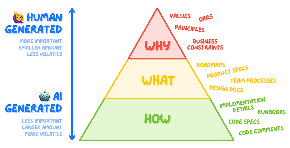 AI is especially useful on the How — we can argue on the quality of AI-generated code, but it is pretty obvious by now that AI documents code better than humans. The Why is and will stay a domain of humans for a long time. It’s where you translate business context into tech decisions, and it’s vital to write this down. It’s also the part that no one, AI or human, can figure out by simply looking at a codebase: it’s additional context that is separate from the software itself. The What is trickier and I guess it’s the real frontier where humans and AI are going to collaborate. Starting from good whys, AI can draft good whats in terms of design docs, system architectures, and even roadmaps. So, this pyramid structure reveals why AI is both making docs less and more important simultaneously: