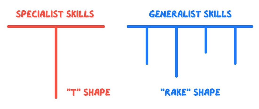 In the industry we are fond of saying we should balance our specialist and generalist sides by building a T-shape, that is: solid foundations across the board + one strong specialty. We also often hear that it is good to build the horizontal leg during the first years of your career, before specializing into something. This is good advice! But it also sounds kind of like: go on and play with things for a few years, but then get your sh*t together and figure out what you want to do as a grown up. Many people do indeed, but some don’t, and end up with shapes that look more like a rake, with various vertical legs of odd, different lengths, protruding from the horizontal base. This is old news and, by now, we shouldn’t overly worry about it. There is plenty of data out there about how generalists eventually do very well in their careers, and above all I am fond of Range, by David Epstein, which basically reads like an ode to generalists. However, this reassurance never felt completely satisfactory to me. My rampant impostor syndrome has often demanded more, which is why I wrote the previous article in the first place — to address how generalists actually fit into software organizations, and how they should think about themselves. Fast forward four years, and I think it’s time for an updated take, largely because of AI. It is no secret that lately I have been writing a lot about this, and one angle I am particularly interested by is how AI is changing what skills are relevant, and how teams are going to change because of it. Of course it’s still early to say, but some trends are already in place, and I think it’s worth talking about them. So here is the agenda for today: